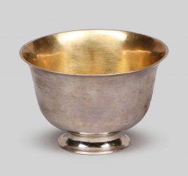 Klarglas, goldene Ein- und braune Aufschmelzungen, schmiedeeisernes Band mit Griffen, H = 18 cm, D = 37 cm bzw. 33 cm, Lippe minim bestoßen, Gebrauchsspuren