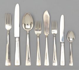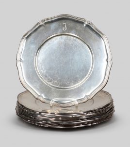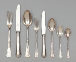 acht Vorspeisenteller, acht Menueteller, elf tiefe Teller und acht Dessertschalen, sechs Suppentassen mit Deckeln und Untertassen, vier Platten und drei Konfektschälchen (48)