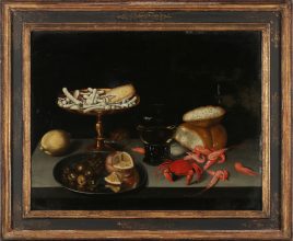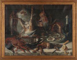 m.u. undeutlich sig., nach einem Original von Peter Binoit (1590-1632), ‚Stillleben mit Tafelaufsatz voller Süßigkeiten, Crevetten, Oliven, Kapern, Zitronen und einer Maus‘, Öl/Holz, 40,5 x 52 cm, restauriert – verso mit Kreide: OMP XV231, Lot 33 30/4/2010, sowie Lacksiegel in Schwarz –