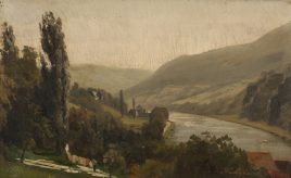 ‚Nachlager am Flussufer unterhalb einer Burg‘, Öl/Holz, 41,5 x 29,5 cm, restauriert