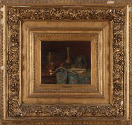 bez. Louis P. Verwée, 19.Jh., ‚Der Kunstfreund‘, verso Reste einer Doppelportraitstudie, Öl/Holz, 50 x 38 cm, restauriert