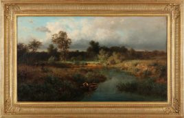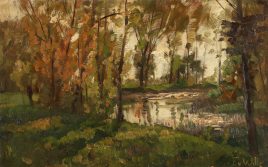 Weimar 1860 – 1941 Düsseldorf, ‚Spätsommerlicher Waldteich‘, Öl/Holz, 20 x 34 cm, Farbfehlstellen