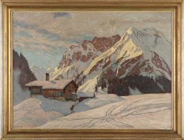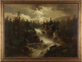 Wien 1828 – 1899 daselbst, ‚Hütten an reissendem Gebirgsbach in mondheller Nacht‘, Öl/Lwd., aufgezogen, 90 x 125 cm, doubliert, restauriert