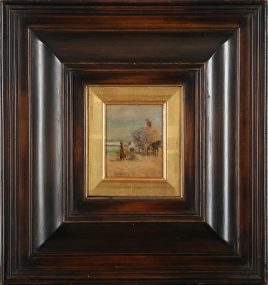 verso bez. Christian Georg Schütz, ‚Ideale Flusslandschaft‘, Öl/Holz, 37 x 35,5 cm, restauriert