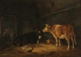 ‚Vieh und Bäuerin im Stall‘, Öl/Lwd., aufgezogen, 28,5 x 40 cm, restauriert