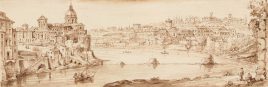 ‚Blick auf Rom vom Tiber‘, braune Tuschfeder, 11 x 32,5 cm (PP-A.), Lichtschaden
