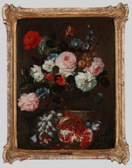 ‚Stillleben mit Blumen und Granatapfel‘, Öl/Lwd., 61 x 45 cm, doubliert, restauriert