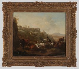 verso auf Etikett bez. Willem Romeyn, ‚Ziegenmelker in arkadischer Landschaft‘, Öl/Holz, 34 x 41 cm, restauriert