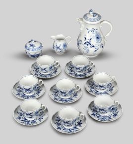 Kurland, weiß, wie: 14 Kaffeetassen mit Untertassen, sechs Teetassen mit fünf Untertassen, sieben Mokkatassen mit Untertassen, elf Teller, D = 20 cm; sieben Teller, D = 15 cm; je sieben Beilagen- und Konfektschalen, ein Eierbecher, Kaffeekanne, je zwei Sahne- bzw. Milchgießer, zwei Zuckerdosen (ein Deckel bestoßen), Marmeladendose sowie zwei Anbietschalen, eine D = 33 cm (96)