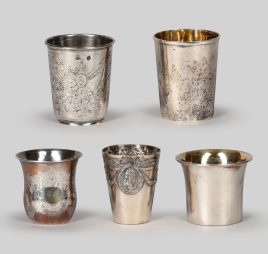 Chinoiserien, polychrom und Gold, sowie Purpur-Camaïeu, Innenvergoldung, Silbermontierung undeutlich punziert, L = 7,5 cm, berieben