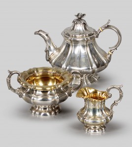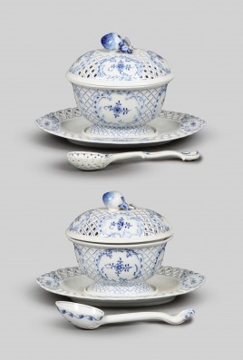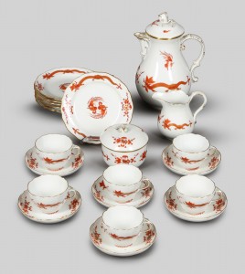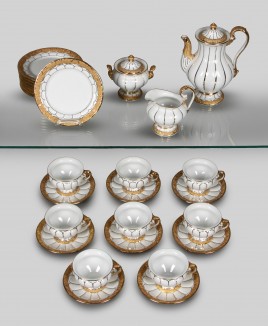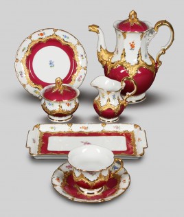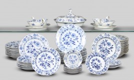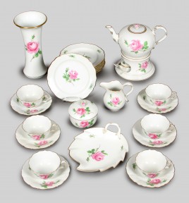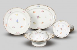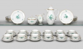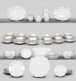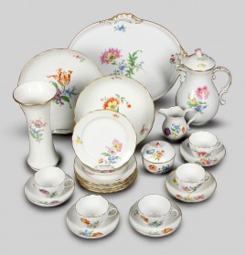 Vollspitze, wie: acht Brotteller, fünf Menueteller, sechs tiefe Teller, zehn Beilagenteller, fünf Konfektschalen und zwei Platten, sowie Halbspitze, wie: fünf Kaffeetassen mit sechs Untertassen und vier Menueteller (51)