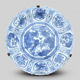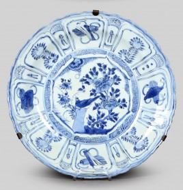 teils kobaltblaue Fahne mit floralem Dekor, D = 29 cm