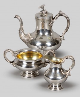 für 18 Personen, dazu zwei Kaffeekannen und Tablett, L = 36 cm (63), eine Tasse beschädigt