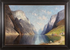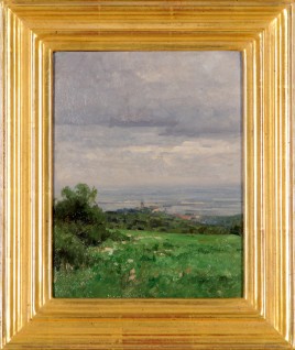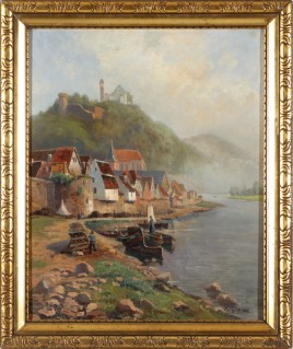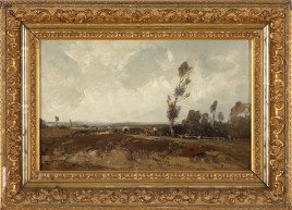 ‚Abendstimmung über belebter Landschaft‘, Öl/Lwd., 63,5 x 87 cm, restauriert, Riss