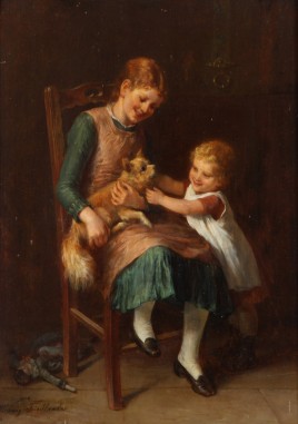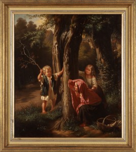 r.u. undeutlich sig., um 1900, ‚Heimliche Beobachter‘, Öl/Lwd., 161 x 94 cm