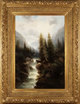 r.u.sig., dat. 1844, Frankfurt/M. 1817 – 1873 Düsseldorf, ‚Lichtung mit Stromschnelle‘, Öl/Lwd., 35 x 53 cm, Farbfehlstellen