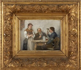 ‚Weinselig in der Taverne‘, Öl/Holz, 28 x 26 cm, restauriert, verputzt