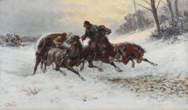 ‚Wolfsattacke auf Troikaschlitten‘, Öl/Lwd., 19 x 32 cm
