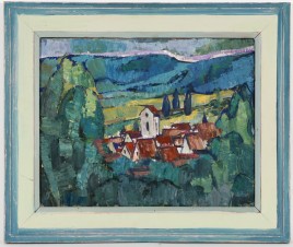 ‚Südländische Hafenstadt‘, Öl/Lwd., 90 x 100 cm, Farbabsplitterungen