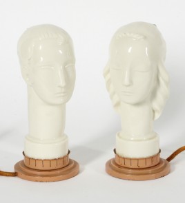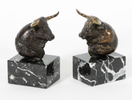 geb. Madrid 1943, ‚Zwei Stierköpfe – Buchstützen‘, Bronze, 59/750, auf weiß gebändertem Marmorsockel, H = je 15 cm