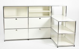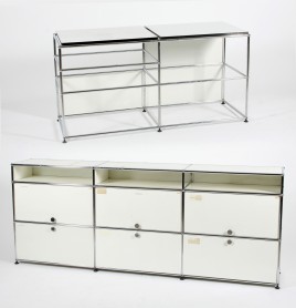 mit weiß lackierten Metalleinsätzen, 109,5 x 202 x 31 cm bzw. 75 x 75 x 52 cm, Kratz- und Gebrauchsspuren
