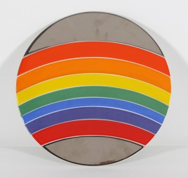 ‚Scheibe‘, Öl/Holz, beidseitig figürliche Malerei, auf Konsole, D = 178 cm bzw. H = 238 cm, beschädigt