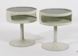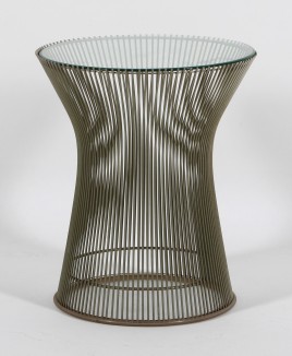 Holz, Metallfuß, Rauchglasplatte, H = 52 cm, D = 45 cm, deutliche Gebrauchsspuren