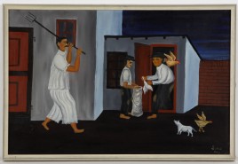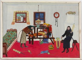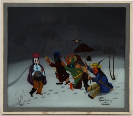 Gola 1928 – 2000 daselbst, ‚Fasenkasi‘, betitelt, Hinterglasmalerei, 36 x 42 cm, Farbfehlstellen – Inv.Nr. J-1020-116 –