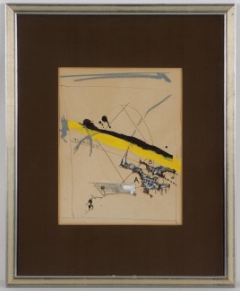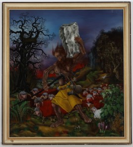 dat. 8. I. 1965, l.u. mit Vers, Varazdinske Toplice 1912 – 1985 Zagreb, ‚Flügelstier und Atompilz‘, Öl/Lwd., 46 x 61 cm, Druckstellen – Inv.Nr. J-1020/003 –