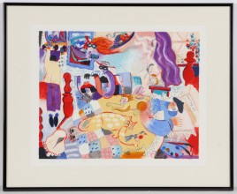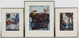 je r.u.handsig., dat. (19)92, Ludwigshafen 1959 – tätig u.a. in Kaiserslautern, ‚Heiterer Garten‘, ‚Tischgesellschaft‘ und ‚Im Blütenwald‘, je betitelt, drei Farbaquatintaradierungen, E.A. bzw. 73/90,, 40 x 30 und 54,5 x 45 cm (865,866,867) *mit /186′