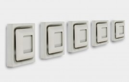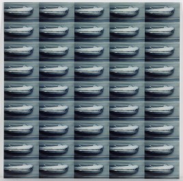 aus fünf Metall-Quadraten, mattweiß lackiert, 154 x 31 x 9 cm, verfärbt