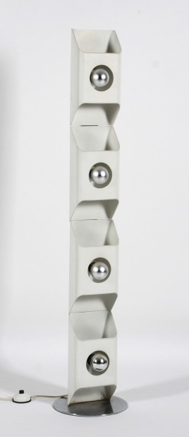 auf Etikett bez., tätig in Orebro und Bonn, ‚eurohopper‘, auf Etikett betitelt, Skulptur, Öl/Holz mit Collage, auf Holzockel, D = 178 cm, bzw. H = 206 cm, unvollständig, fleckig