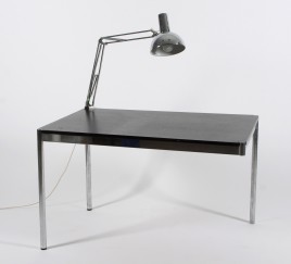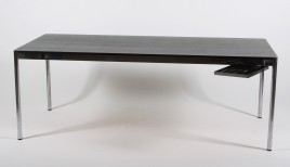 74 x 204 x 90 cm, schwarze Holzplatte mit Kratzspuren, Bleistiftschale beschädigt