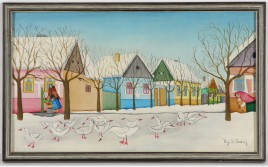 geb. Kovacica 1930, ‚Winterliche Dorfstraße‘, Öl/Lwd., 33 x 57 cm, Farbfehlstelle – Inv.Nr. J-1020/120 –