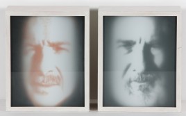 Minsk 1973 – tätig in Düsseldorf, ‚Prof. Lupertz‘ und ‚Prof. Graulner‘, je verso betitelt, zwei Arbeiten, Fotografie, Plexiglas, Holzkasten, je 28 x 23 x 13 cm, Kratzspuren (10,11)