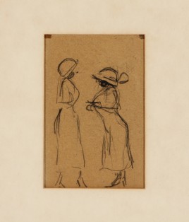 Radeburg 1858 – 1929 Berlin, ‚Zwei Frauen im Gespräch‘, Kohlestudie, auf ausgeschnittenem Briefumschlag von Kunsthandlung Rich. Bong, Berlin, W.57, Potsdamer Str. 88, an Herrn Kunstmaler Heinrich Zille, Charlottenburg, Briefmarke fehlt, 15,3 x 10 cm (Blatt), Lichtschaden, gebräunt, Klebstreifenrückstände, o.R.