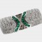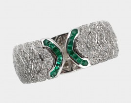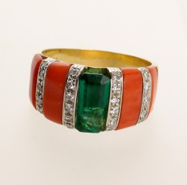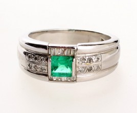besetzt mit einem Smaragd im Tafelschliff von ca. 0,45 ct., flankiert von zwölf Brillanten und zwölf Diamant-Trapezen von zus. ca. 0,25 ct., RW 54, ca. 9,7 g, Gebrauchsspuren, drei Brillanten bestoßen