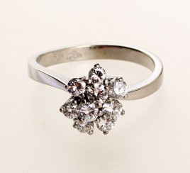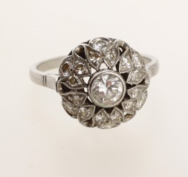oder Platin, besetzt mit einem Brillant von ca. 0,22 ct., umgeben von sechs Diamanten im 16/16-Schliff und zwölf Diamanten im 8/8-Schliff von zus. ca. 0,25 ct., RW 49, ca. 4,2 g, Ringschiene restauriert