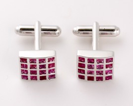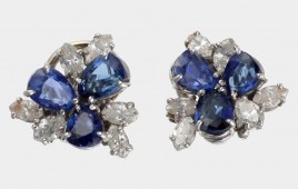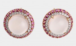 besetzt mit je einem Rosenquarz-Cabochon, D = ca. 9,9 mm, umgeben von je 28 Brillanten von zus. ca. 0,28 ct. und je 24 rund-facettierten pinkfarbenen Saphiren von zus. ca. 0,80 ct., ca. 7,6 g – Abb. auf dem Umschlag –