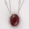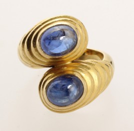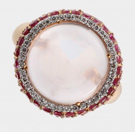 einem Rosenquarz-Cabochon, D = ca. 12,8 mm, umgeben von 38 Brillanten von zus. ca. 0,19 ct. und 48 pinkfarbenen Saphiren von zus. ca. 1 cts., RW ca. 56, ca. 6,9 g – Abb. auf dem Umschlag –