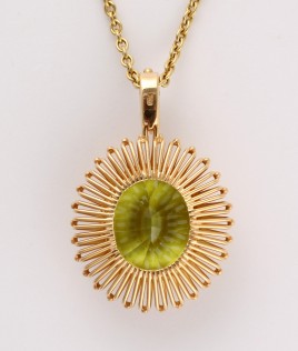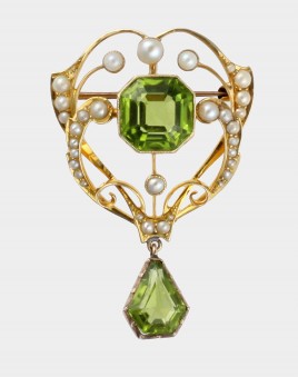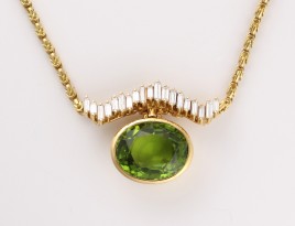 besetzt mit einem Peridot im Tafelschliff von ca. 6,50 cts. und 31 Halbperlen, D = ca. 1,0 – 3,7 mm, anhängend ein tropfenförmig-facettierter Peridot von ca. 2,50 cts., ca. 8,1 g, restauriert – Abb. S. 2 –