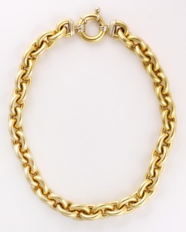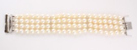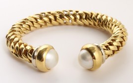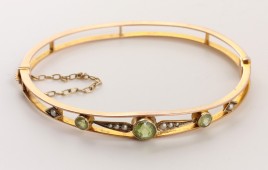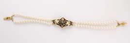 Mittelteil besetzt mit drei Peridoten im Tafelschliff von zus. ca. 19 cts. und 18 Halbperlen, D = ca. 2,5 mm, L = 19 cm, mit Elastoflexband, ca. 14,9 g, Peridot berieben – Abb. S. 2 –