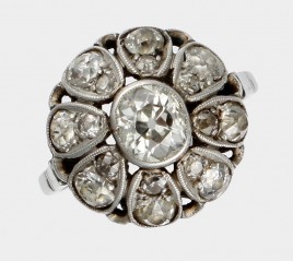 oder Platin, besetzt mit einem Altschliff-Brillant von ca. 2,30 cts., mittlerer Farb- und hoher Reinheitsgrad und 24 Altschliff-Diamanten von zus. ca. 0,20 ct., durchschnittlich mittlerer Farb- und Reinheitsgrad, RW 52, ca. 4,0 g, Gebrauchsspuren, Ringschiene restauriert – Abb. S. 4 –