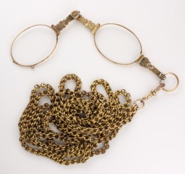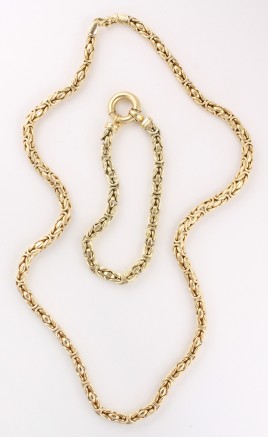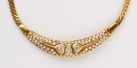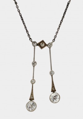 14 K Roségold und Platin, besetzt mit zwei Altschliff-Brillanten von zus. ca. 0,20 ct., zwei Altschliff-Brillanten und fünf Diamanten im 8/8-Schliff von zus. ca. 0,10 ct., L = 42 cm, ca. 4,3 g, restauriert, mit Ergänzungen, im Etui (V)