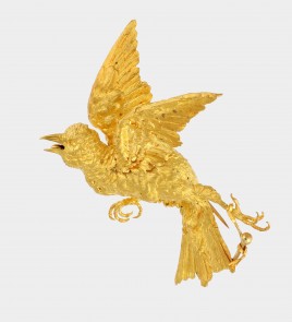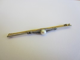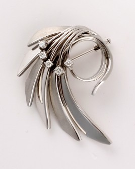 14 K GG und WG, besetzt mit einem Brillant von ca. 0,25 ct., umgeben von 36 Diamantrosen, L = 10,4 cm, ca. 6,4 g, Nadel leicht verbogen – Abb. S. 5 –