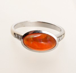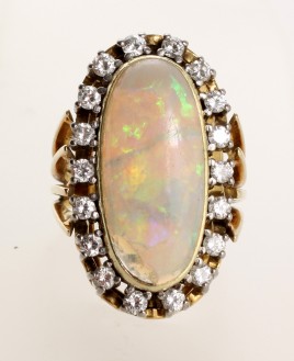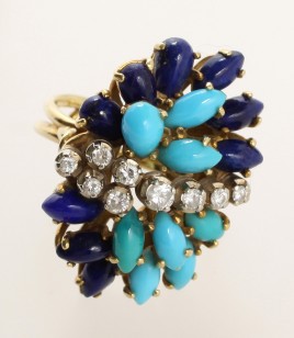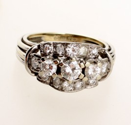besetzt mit einem ovalen Altschliff-Diamant von ca. 0,60 ct. und 16 Altschliff-Diamanten von zus. ca. 0,50 ct., RW 52, ca. 5,4 g, Gebrauchsspuren – Abb. S. 5 –