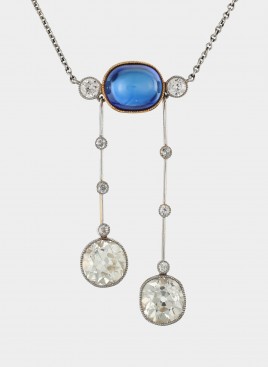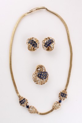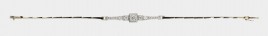 18 K WG, besetzt mit sieben Altschliff-Brillanten von zus. ca. 1 ct., 18 facettierten Saphir-Baguetten und 26 Diamantrosen, L = 19 cm, ca. 10,8 g, Gebrauchsspuren, mit Ergänzungen, ein Saphir beschädigt – Abb. S. 4 –
