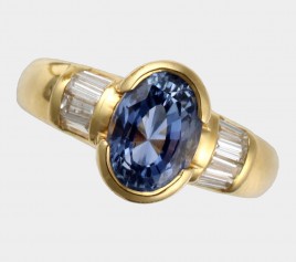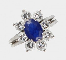14 K WG, besetzt mit einer Saphir-Baguette von ca. 0,50 ct., zwei Altschliff-Brillanten von zus. ca. 0,25 ct., vier Altschliff-Brillanten und zwölf Diamanten im 8/8-Schliff von zus. ca. 0,20 ct., RW ca. 51, ca. 3,8 g – Abb. S. 5 –