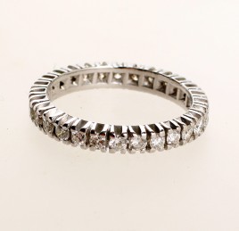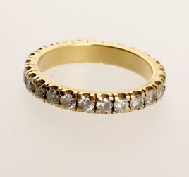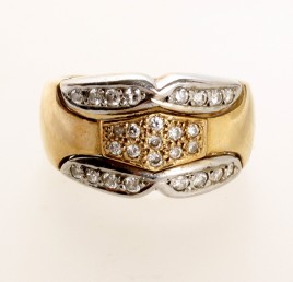 besetzt mit zwölf Brillanten von zus. ca. 1 ct., durchschnittlich oberer bis mittlerer Farb- und geringer Reinheitsgrad, RW 53, ca. 4,0 g, Gebrauchsspuren, zwei Brillanten berieben