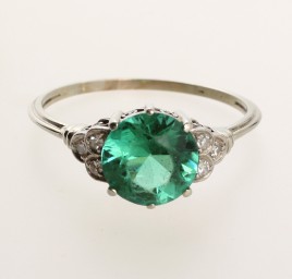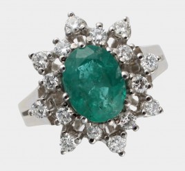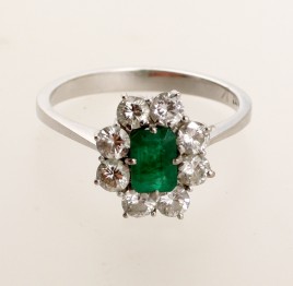 besetzt mit einem Smaragd im Tafelschliff von ca. 0,20 ct., umgeben von acht Altschliff-Brillanten und sechs Diamanten im 8/8-Schliff von zus. ca. 0,35 ct., RW 53, ca. 2,4 g, Smaragd berieben